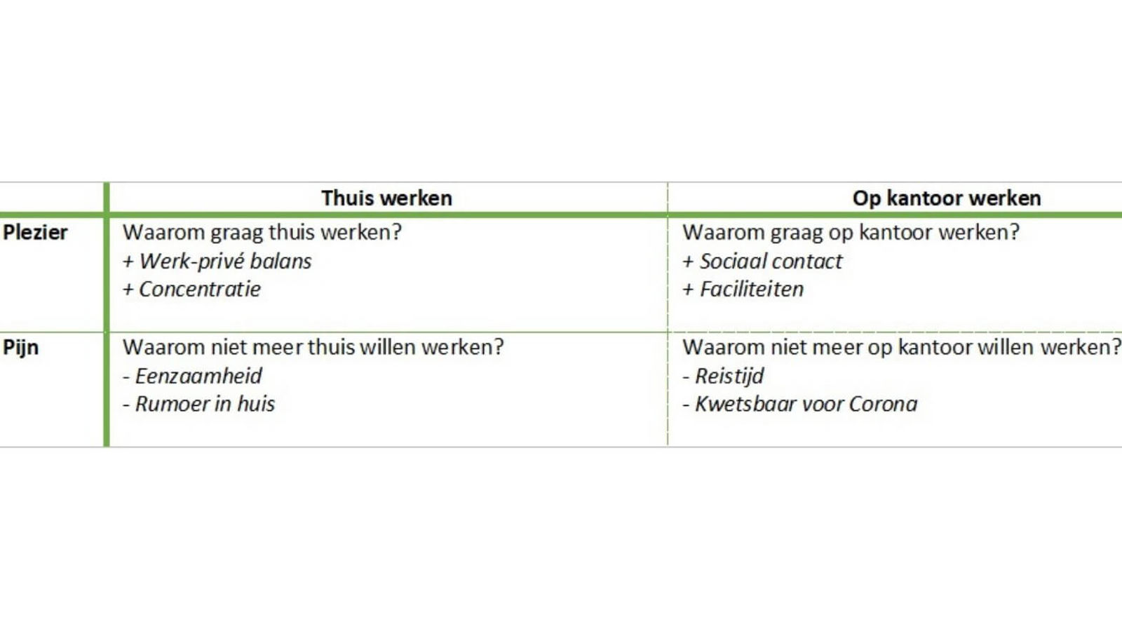Waar de een het thuiswerken als fantastisch ervaart, vinden anderen het niks. Om de ervaringen en behoeften in kaart te brengen in jouw organisatie is het goed om het gesprek aan te gaan over 'de pijn en het plezier' van het thuis en op kantoor werken. In individuele gesprekken met medewerkers is het belangrijk om 4 vragen te stellen:
