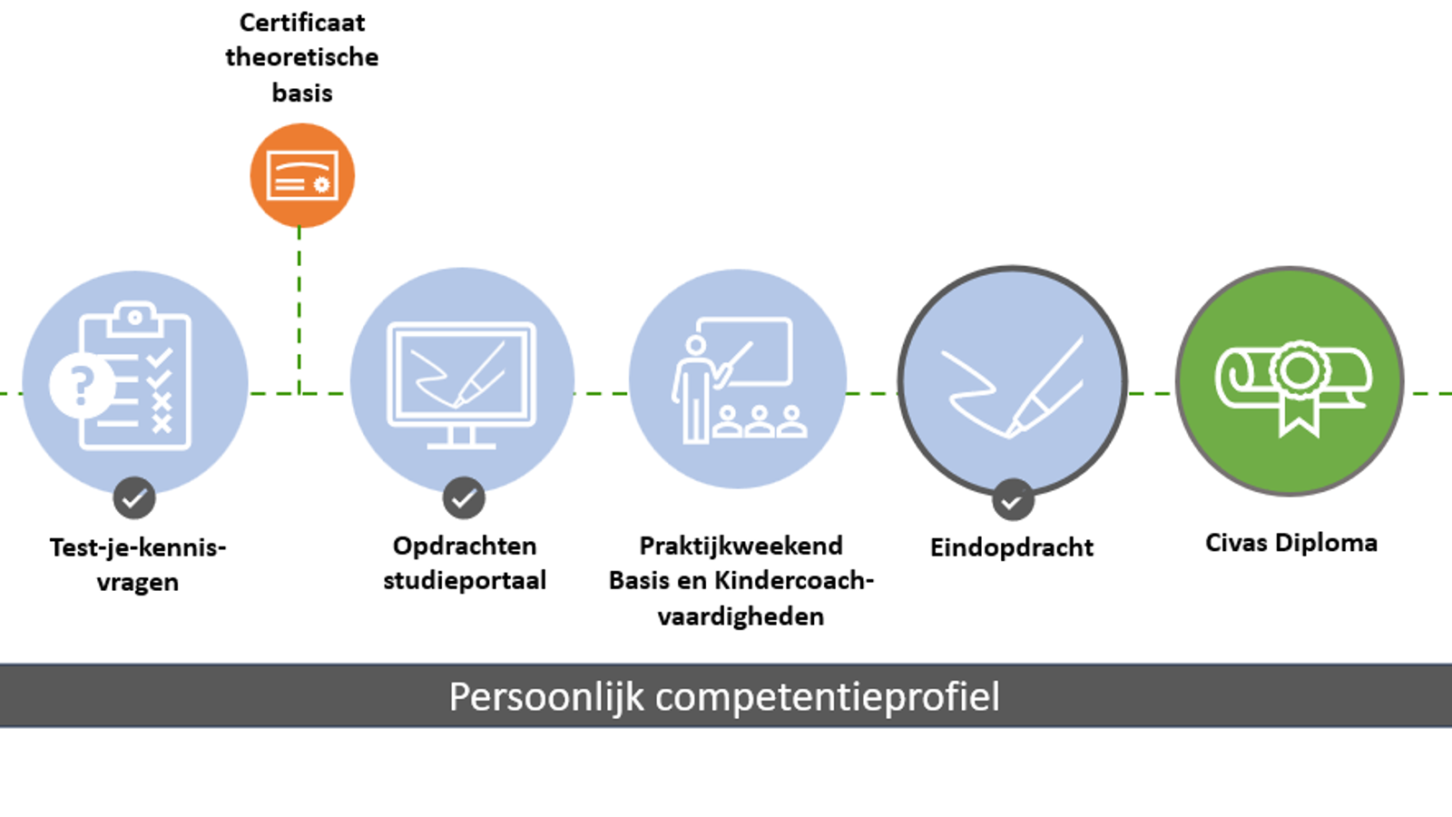 Je werkt zelfstandig aan deze opdrachten en bouwt ondertussen aan je persoonlijk competentieprofiel: een helder overzicht van jouw groei en vaardigheden als kindercoach.