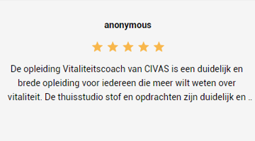 Bij een gemiddelde score van 5,5 of hoger voor het ingezonden huiswerk en een voldoende voor het thuis af te leggen examen ontvang je het Civas-diploma Vitaliteitscoach. |